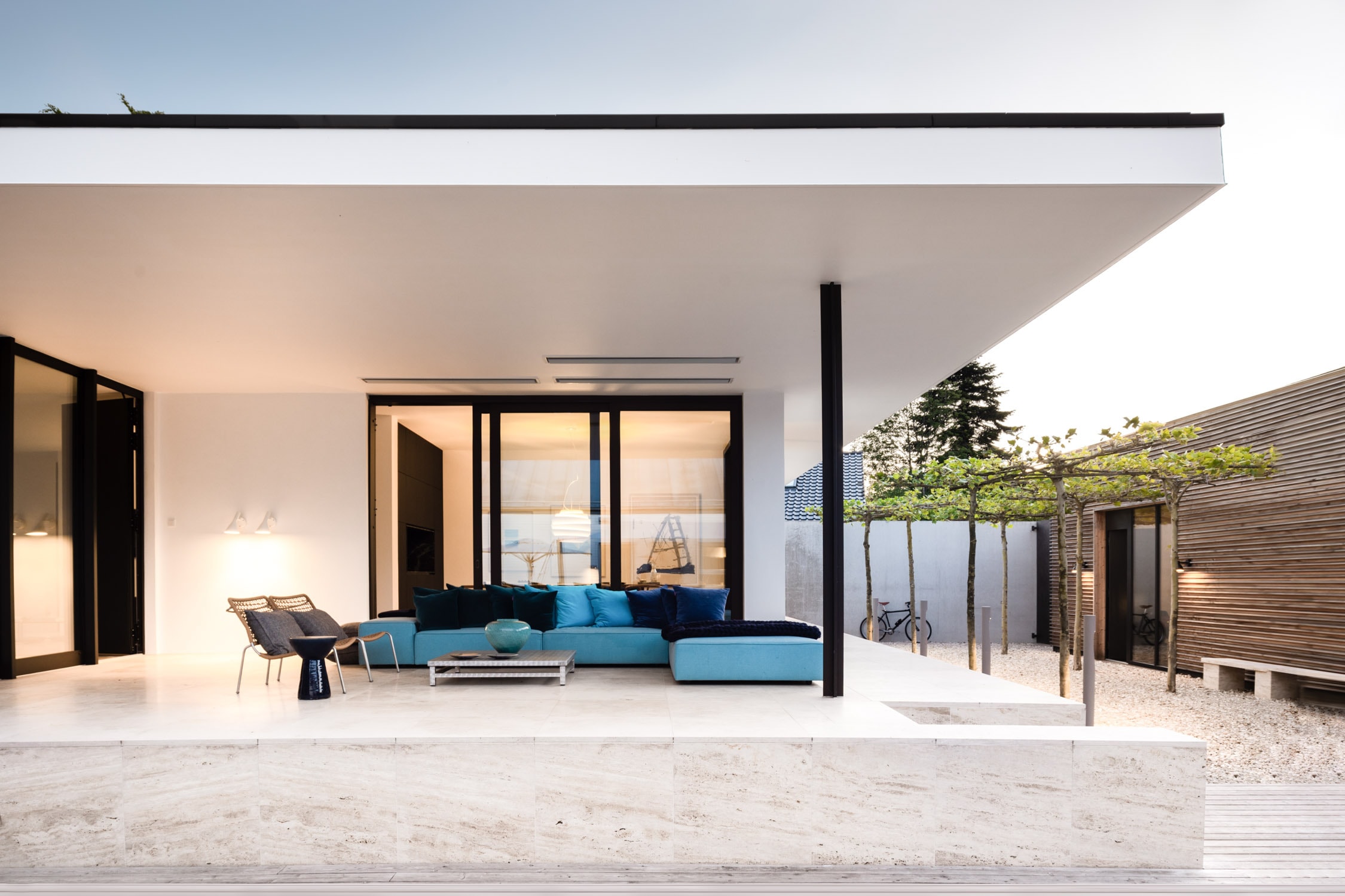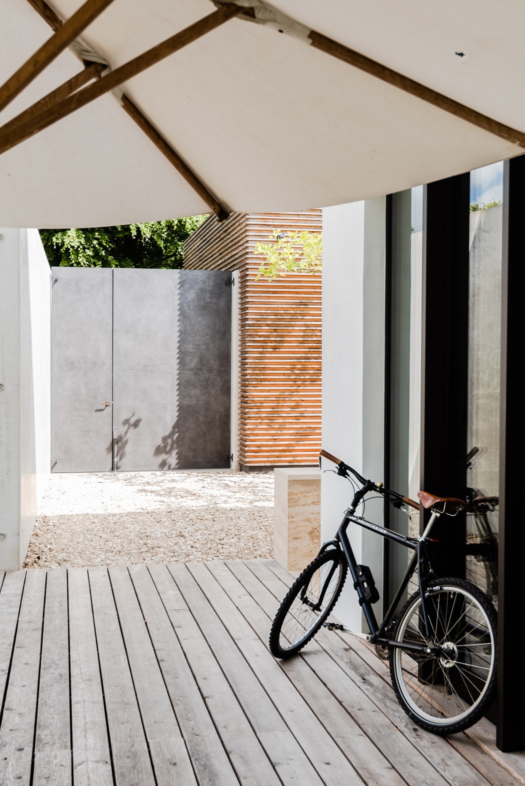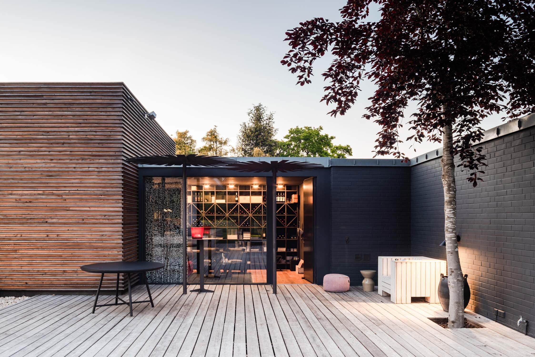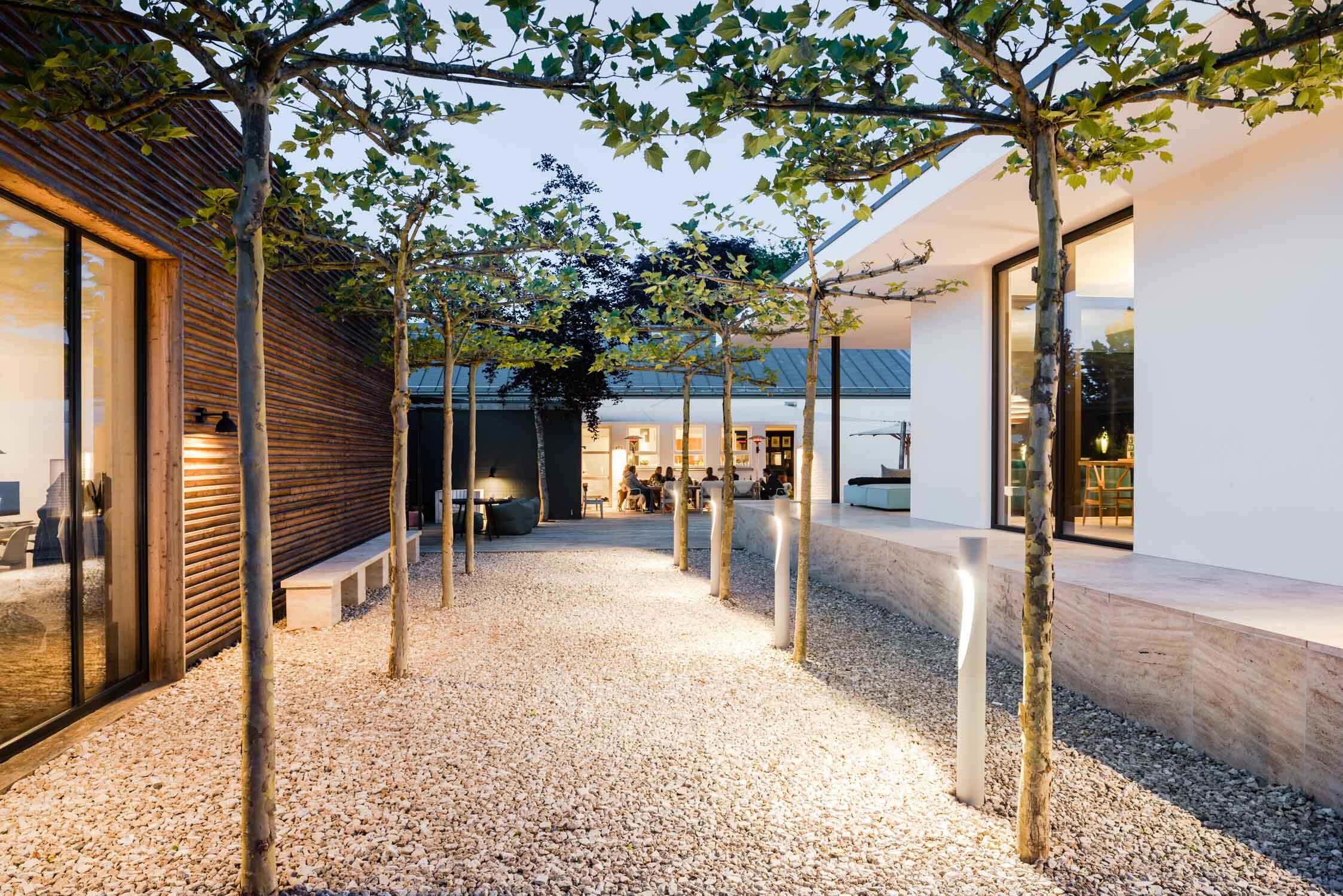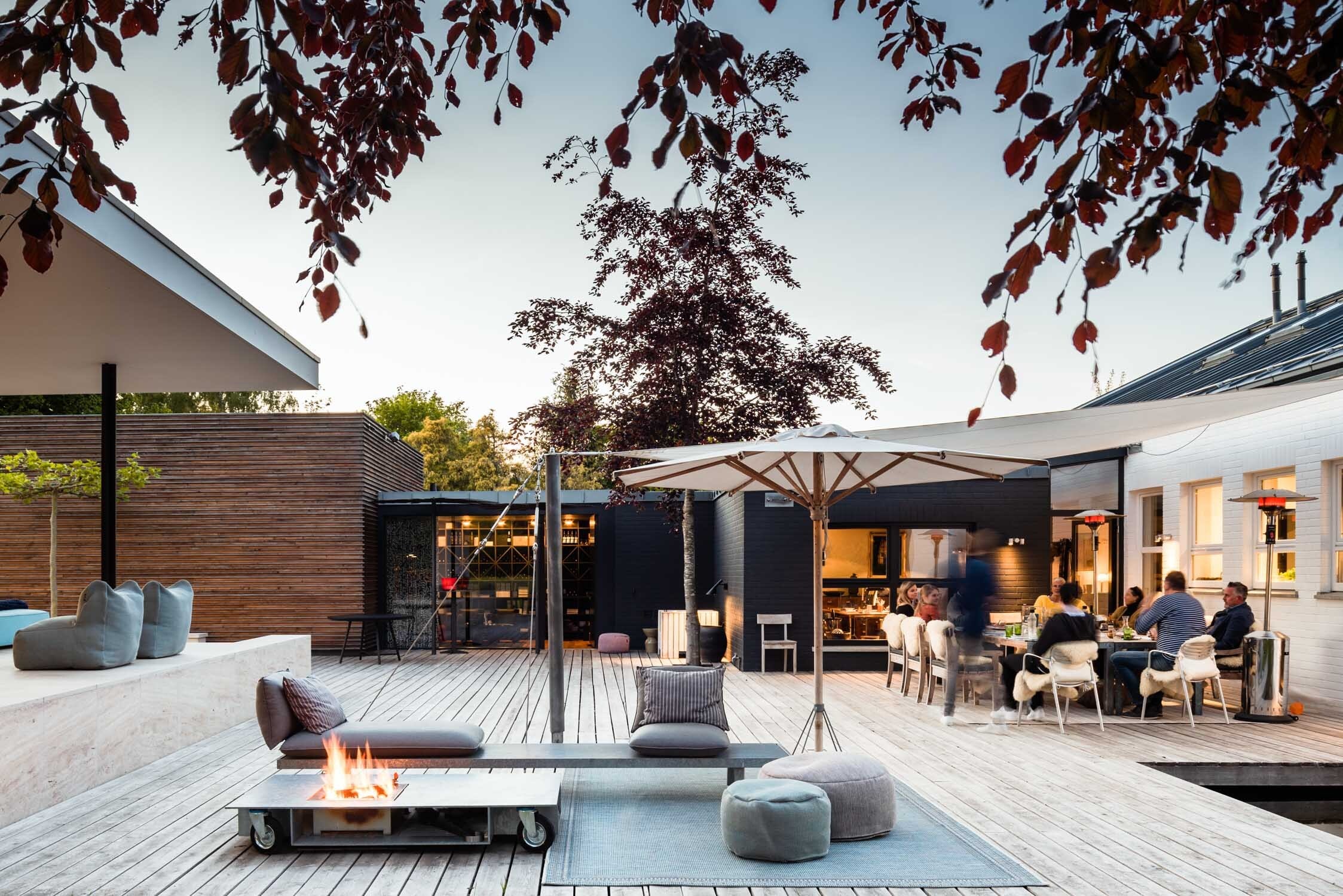Die Terrassen zwischen Bestand, Thinktank und Gästehaus sind in Fortführung der Materialität der Holzfassade ebenfalls in sibirischer Lärche umgesetzt worden. Das Ensemble ist in nachhaltiger Bauweise ausgeführt und als Nullenergiehaus realisiert worden.