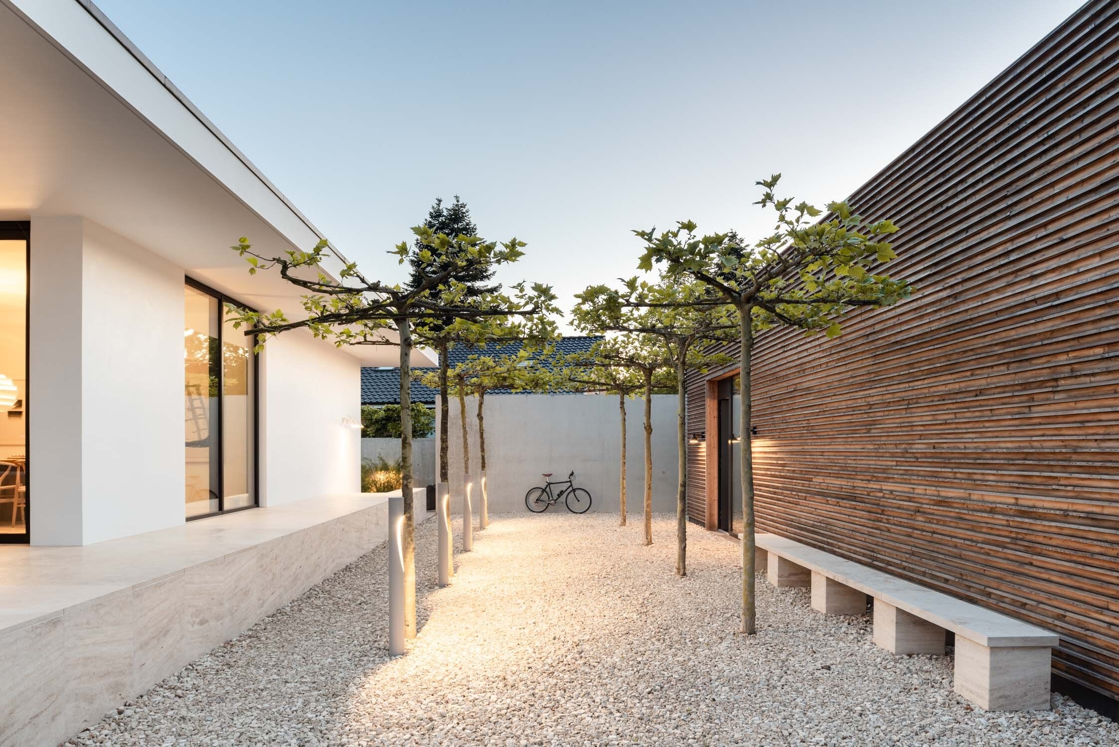 Der Freiraum verbindet die Gebäude sinnhaft, es entstehen Räume der Kommunikation und des Rückzugs. Mit dem Neubau ist ein Ensemble entstanden, das die konzeptuelle Idee des Büros unterstützt. Das Gästehaus stellt das zentrale Element dar, die Sockelhöhe beträgt 70 cm. Auf der Sockelebene sind 2 Arbeitsplätze und der Besprechungsraum angeordnet, auf der Gartenebene der Gästetrakt. Das Gebäude ist monolithisch mit gedämmten Planziegeln errichtet. Die Flachdachkonstruktion wurde als Holzbalkendecke mit Zwischensparrendämmung ausgeführt und mit einem allseitigen Dachüberstand von 150 cm ausgestattet. Das Mauerwerk hat innen und außen einen Kalkzementputz als Unterputz erhalten, als Oberputz wurde ein Haga Kalkputz aufgezogen, der bis zur Kalkglätte verdichtet und verseift wurde.