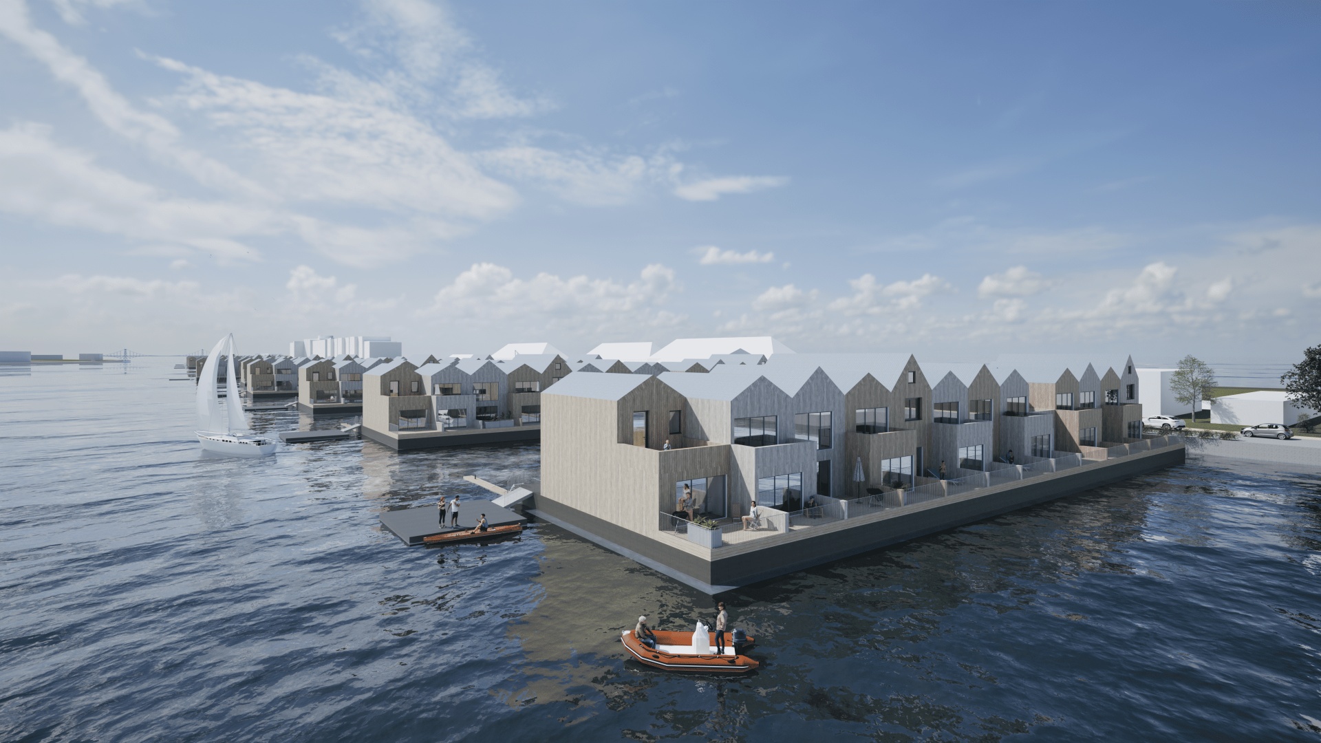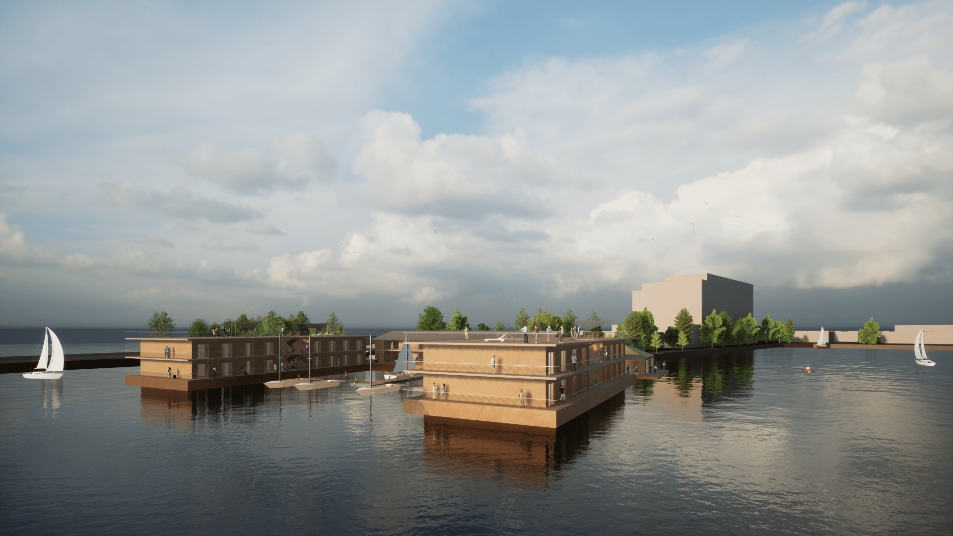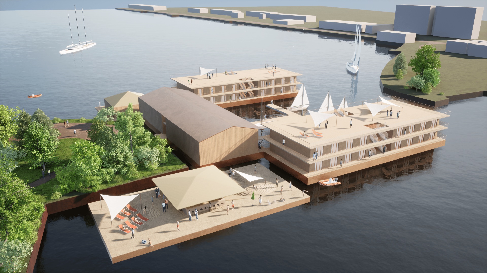 Reihenhaussiedlungen auf schwimmenden Pontons direkt am Südstrand; Wasser-Jugendherberge in Ergänzung zum Atlantic Hotel und B&B Hotel