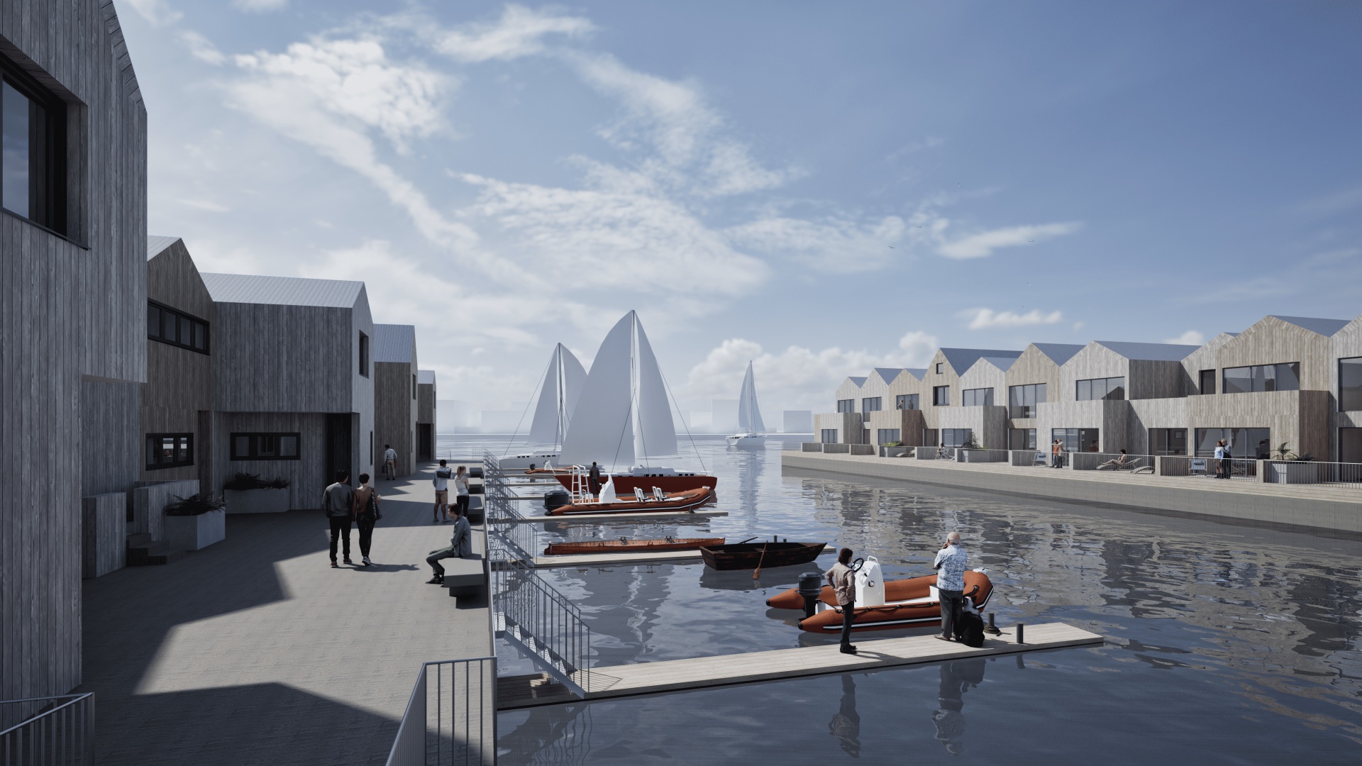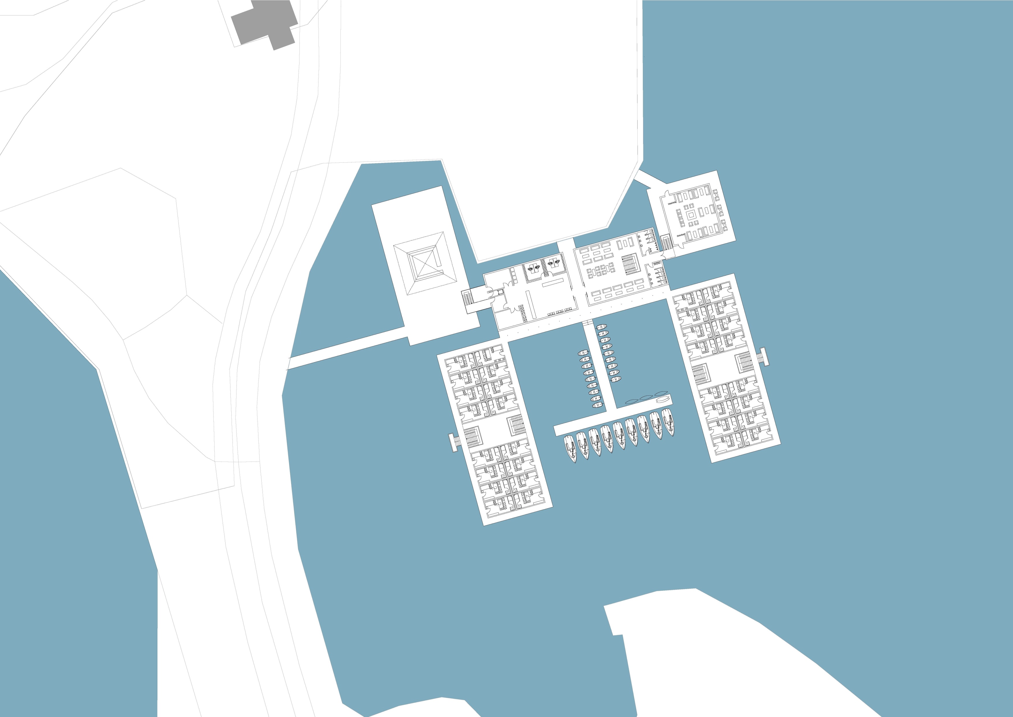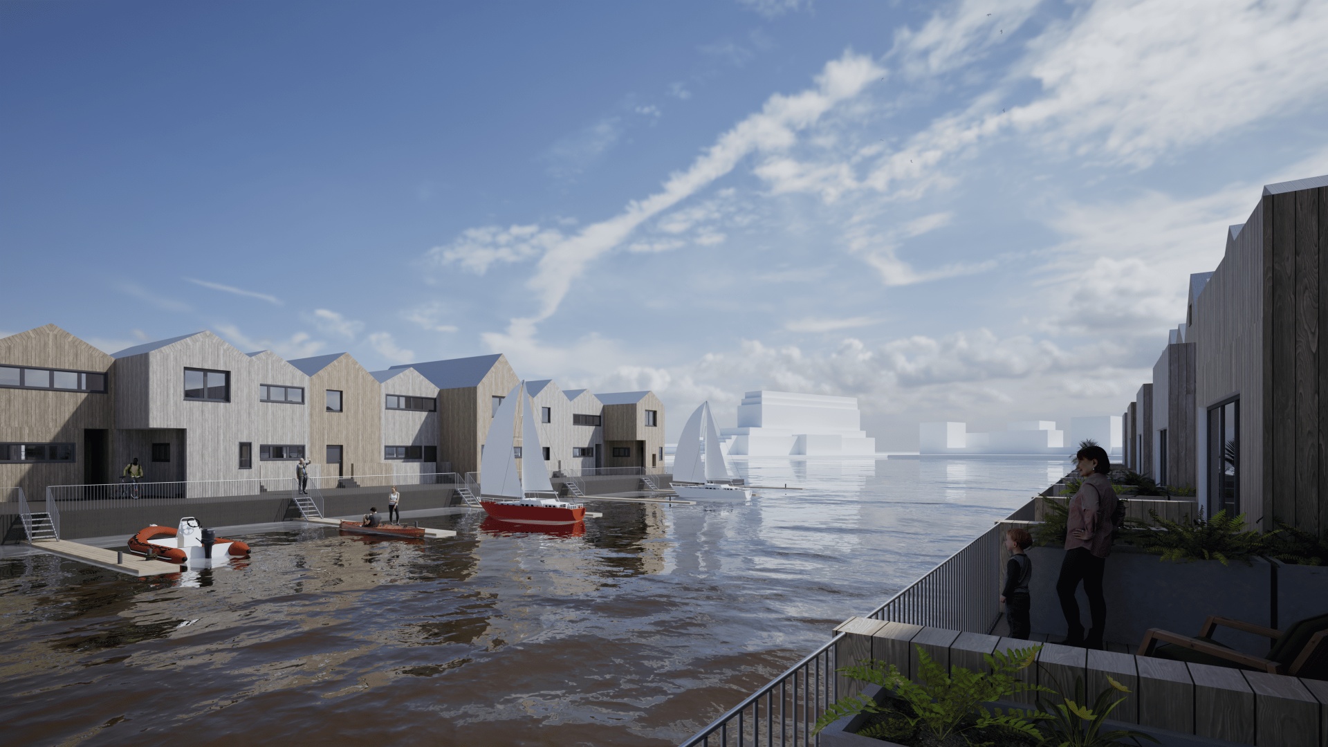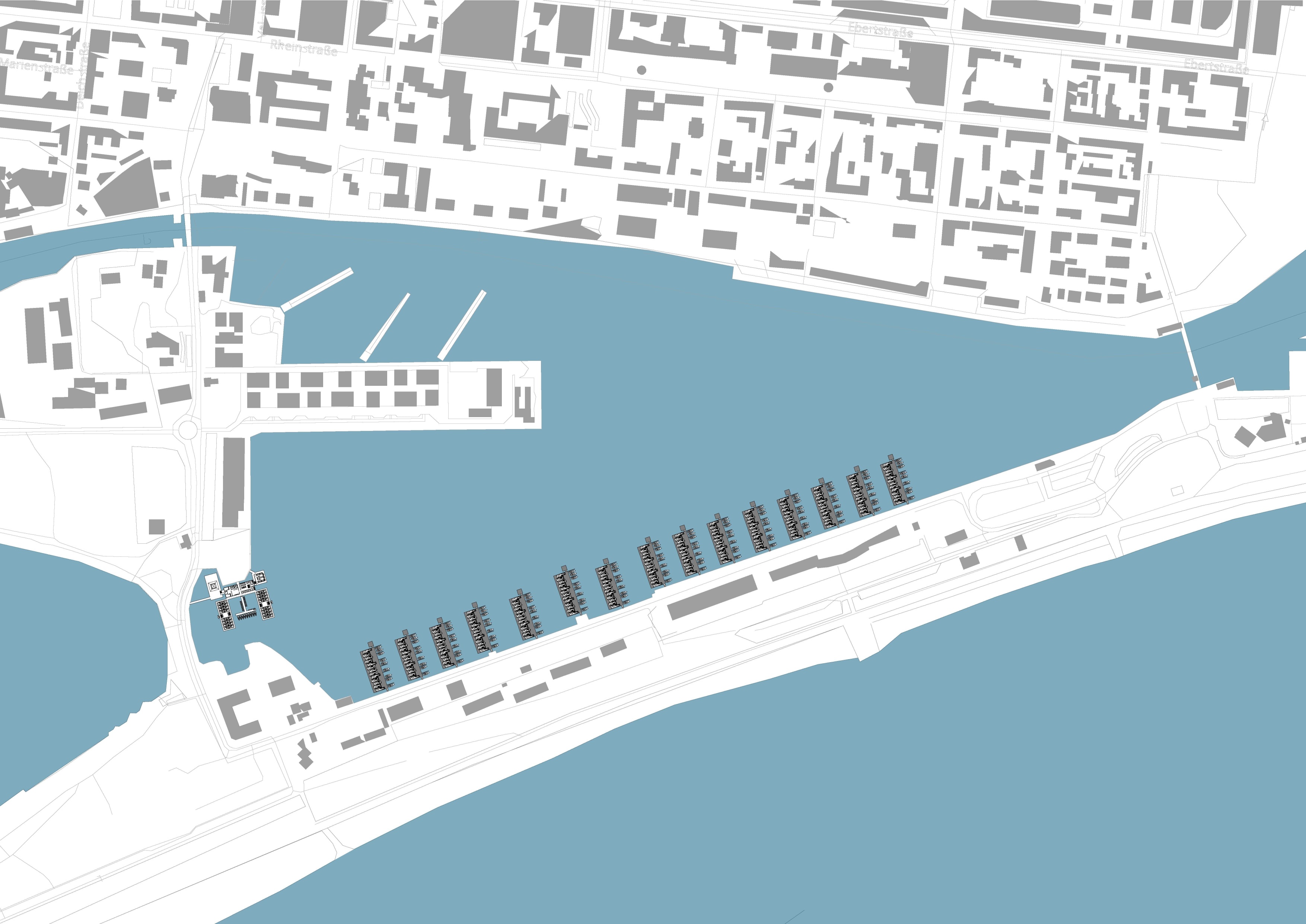 Reihenhaussiedlungen auf schwimmenden Pontons direkt am Südstrand; Wasser-Jugendherberge in Ergänzung zum Atlantic Hotel und B&B Hotel