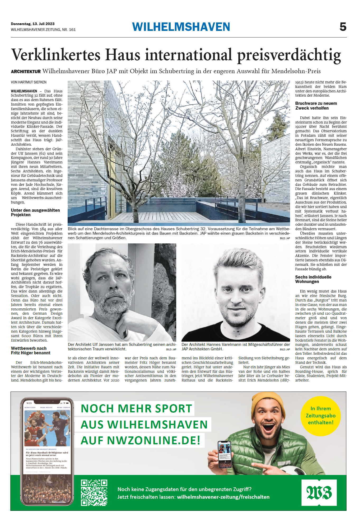 Wilhelmshaven – Das Haus Schubertring 32 fällt auf, ohne dass es aus dem Rahmen fällt. Inmitten von gepflegten Einfamilienhäusern, die schon einige Jahrzehnte alt sind, besticht der Neubau durch seine moderne Eleganz und die individuelle Klinker-Fassade. Der Schriftzug an der dunklen Haustür verrät, wessen Handschrift das Haus trägt: JAP Architekten. Dahinter stehen der Gründer Ulf Janssen (62) und sein Kompagnon, der rund 30 Jahre jüngere Hannes Varelmann mit ihren neun Mitarbeitern. Sechs Architekten, ein Ingenieur für Gebäudetechnik und Janssens ehemaliger Professor von der Jade Hochschule, Jürgen Arendt, sind die kreativen Köpfe. Arend kümmert sich um Wettbewerbs-Ausschreibungen.